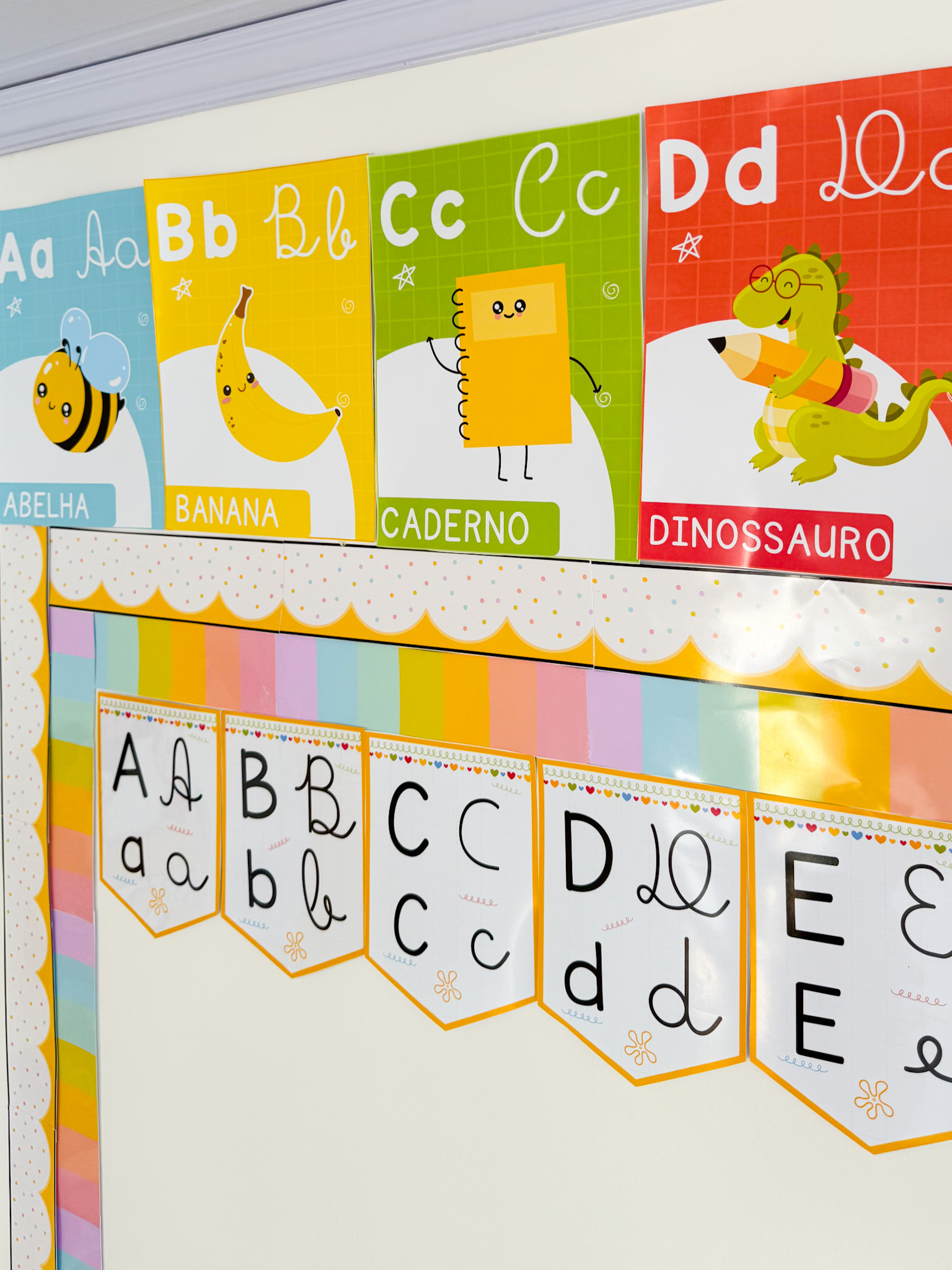 Indicado para salas de aula, murais, varais pedagógicos e atividades de alfabetização, auxiliando no reconhecimento das letras e na ambientação pedagógica.