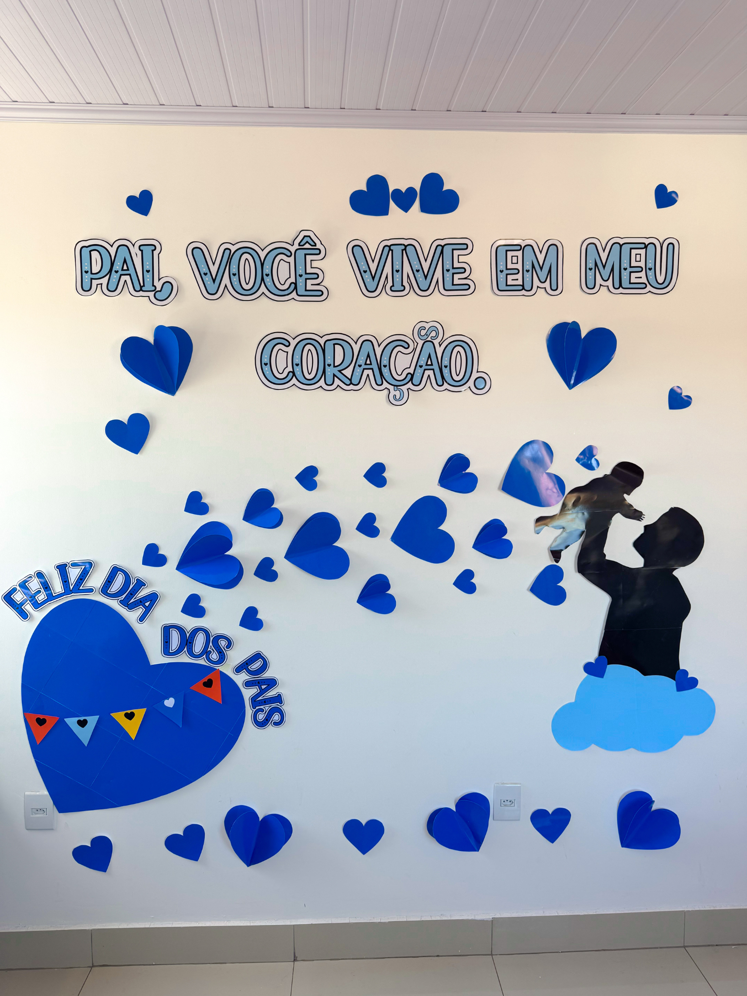Um painel delicado, afetivo e cheio de amor para emocionar neste Dia dos Pais! Com tons de azul, corações 3D e a frase central “Pai, você vive em meu coração”, ele é ideal para criar um clima acolhedor e especial na sua escola.