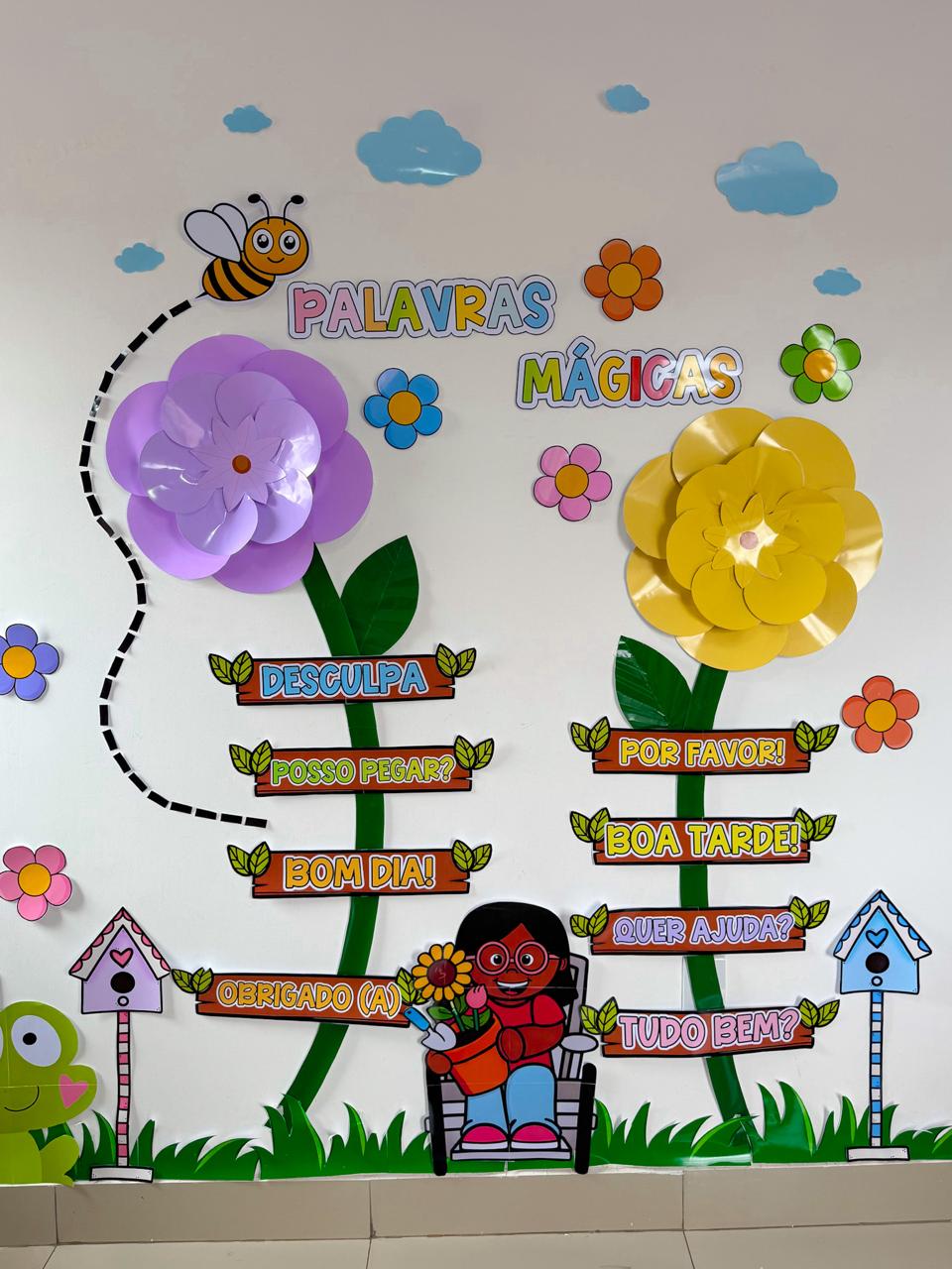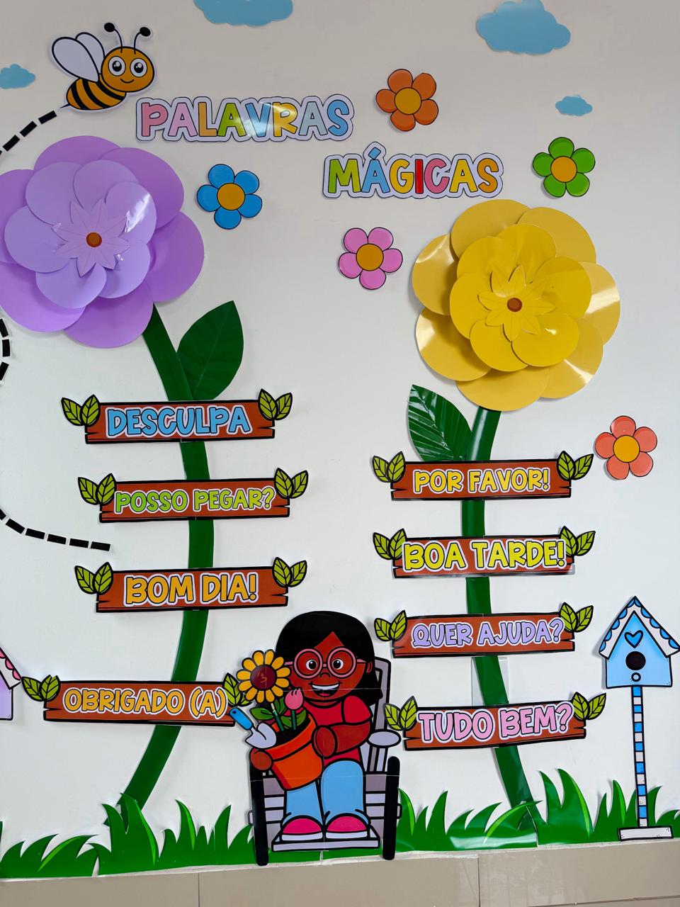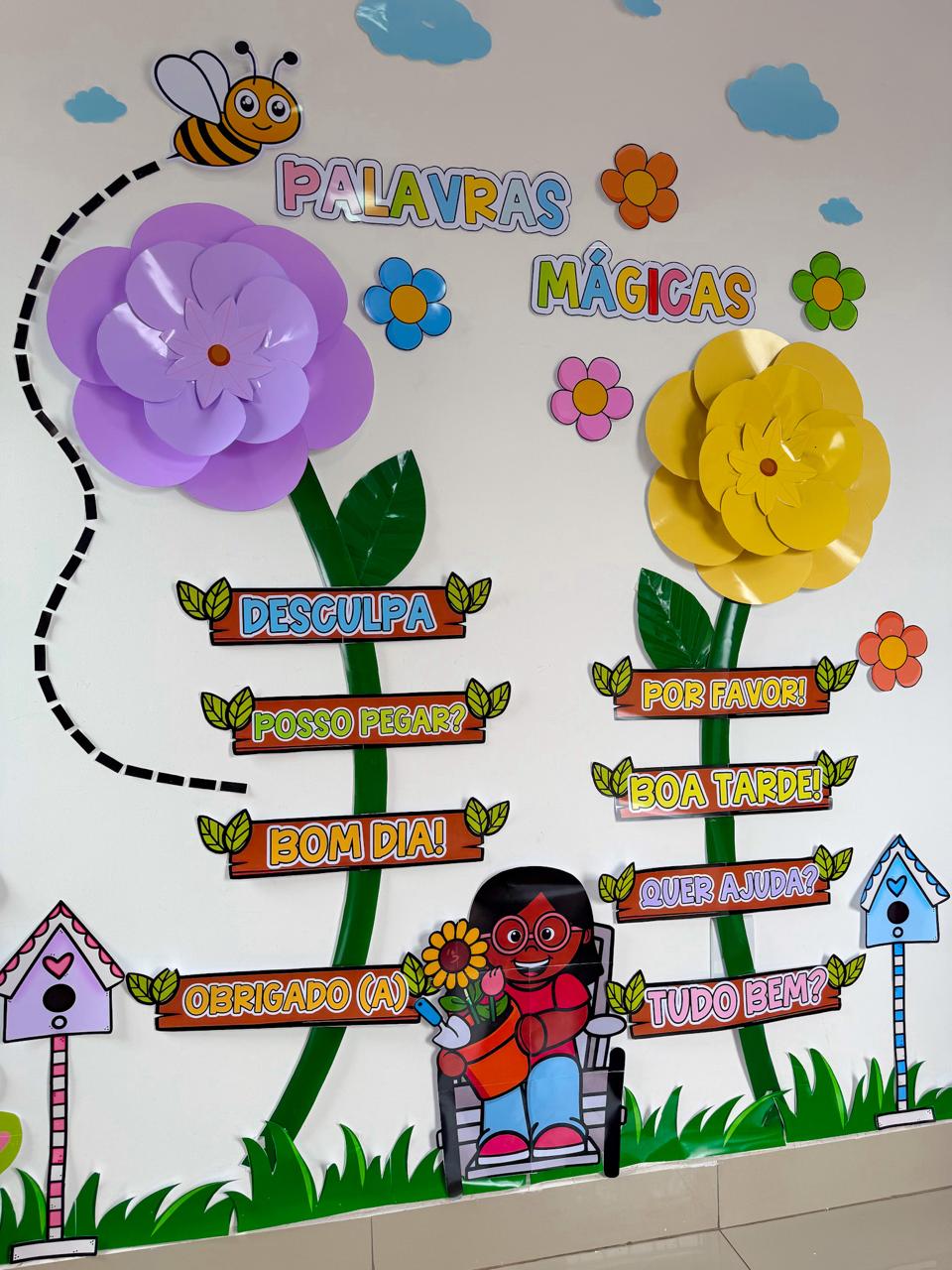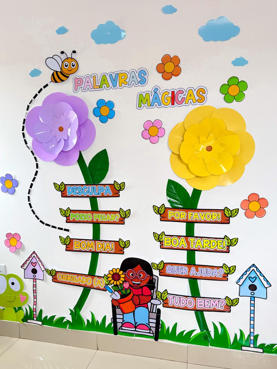 Painel pedagógico decorativo para trabalhar valores, convivência e boas maneiras de forma visual e atrativa, incentivando o uso diário das palavras mágicas na rotina escolar.