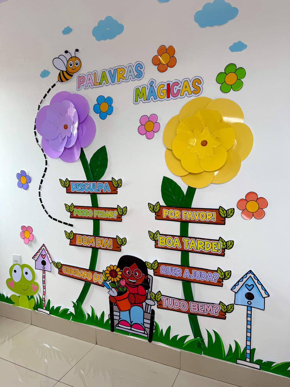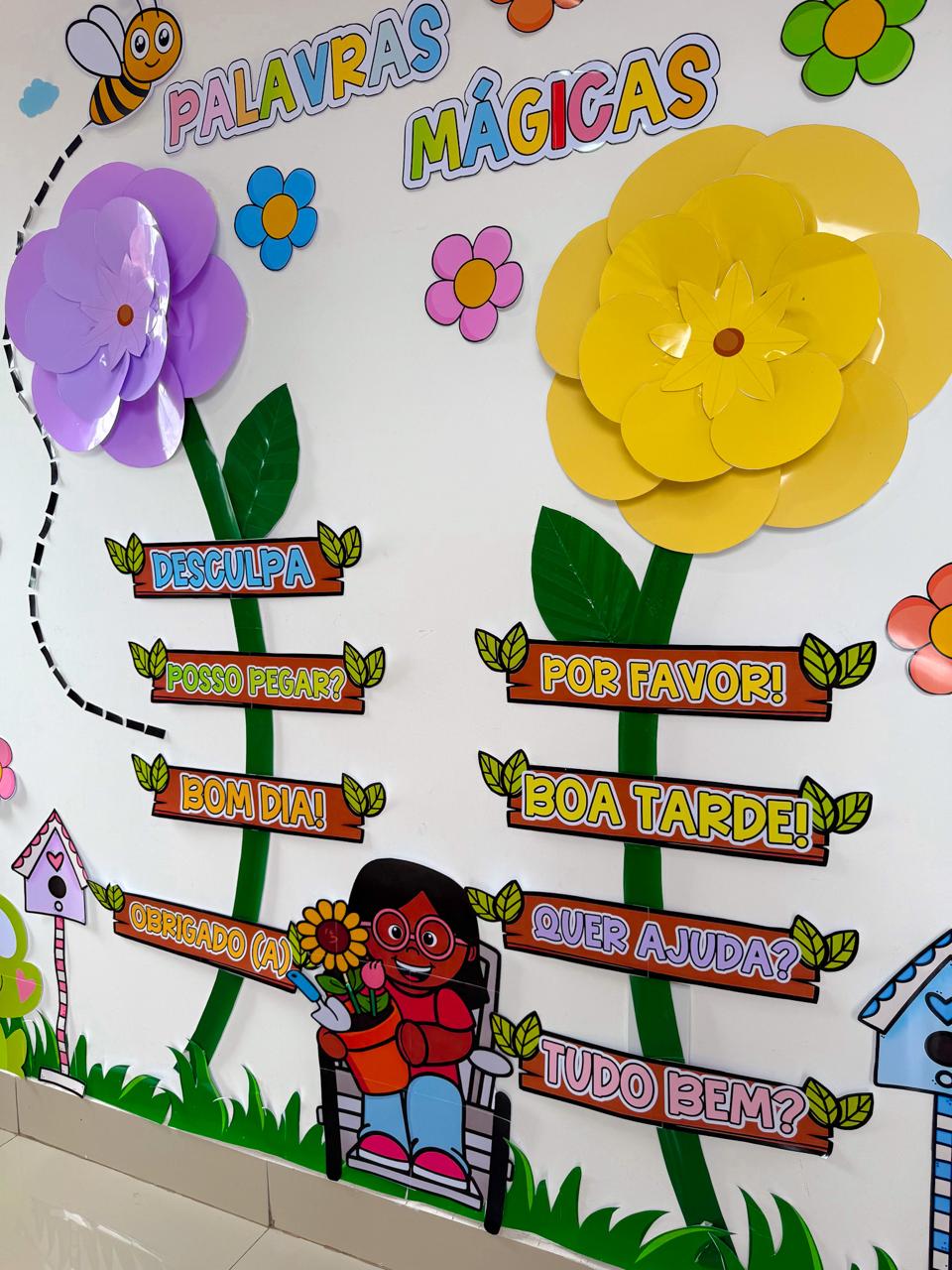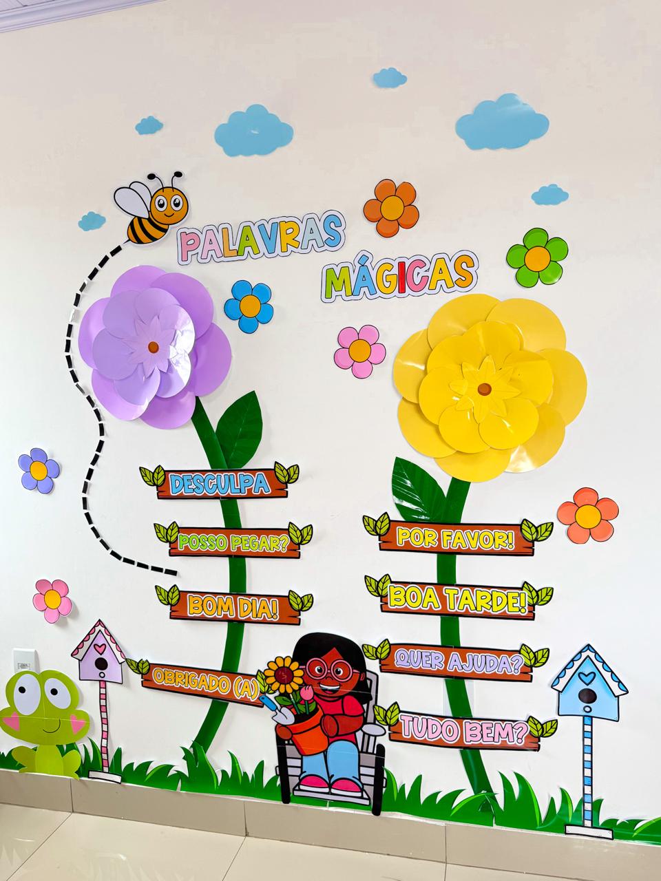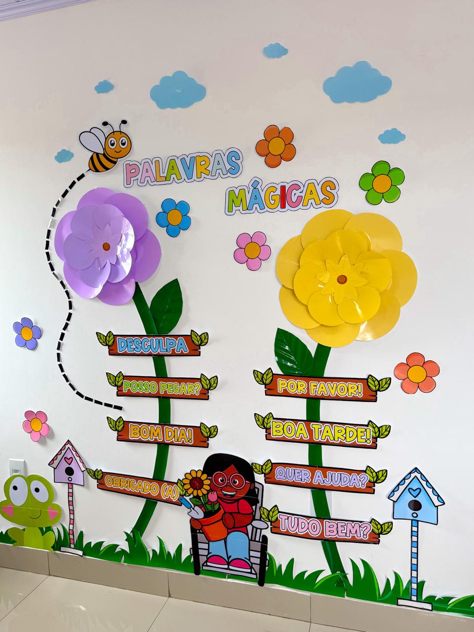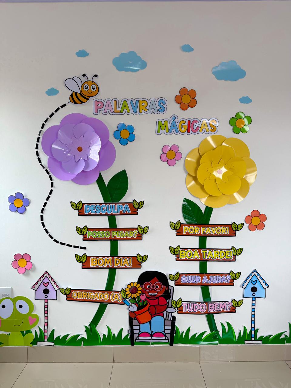 Painel pedagógico decorativo para trabalhar valores, convivência e boas maneiras de forma visual e atrativa, incentivando o uso diário das palavras mágicas na rotina escolar.