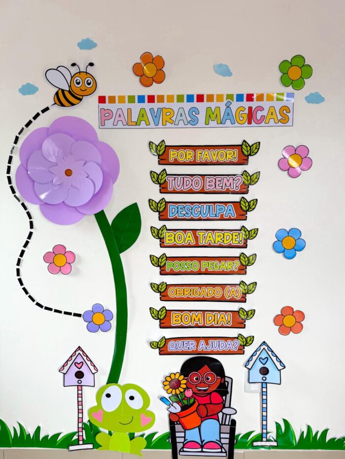 Painel pedagógico decorativo ideal para trabalhar valores, convivência e boas maneiras de forma lúdica e visual. Com temática de jardim, torna o ambiente mais acolhedor e estimula o uso diário das palavras mágicas na rotina escolar.