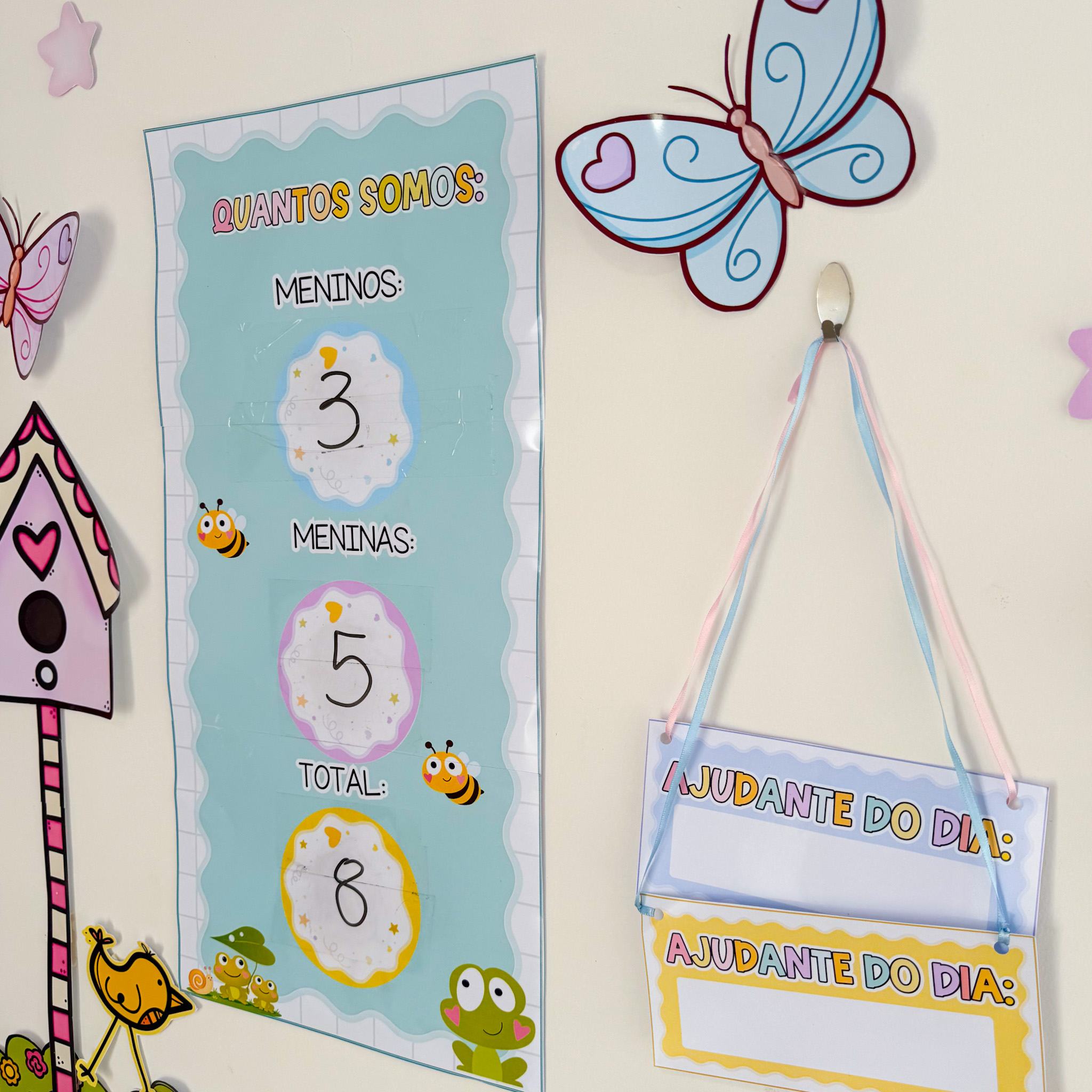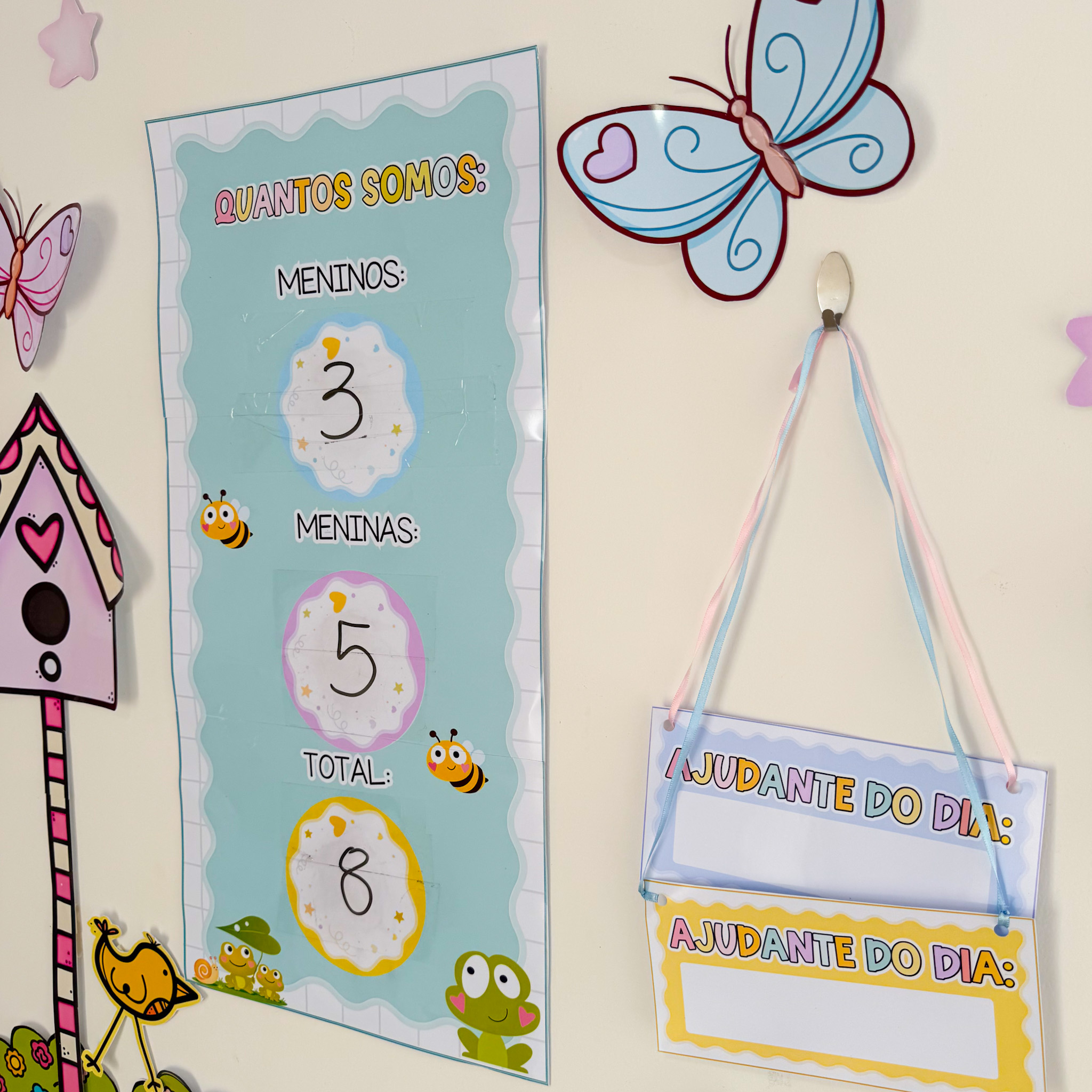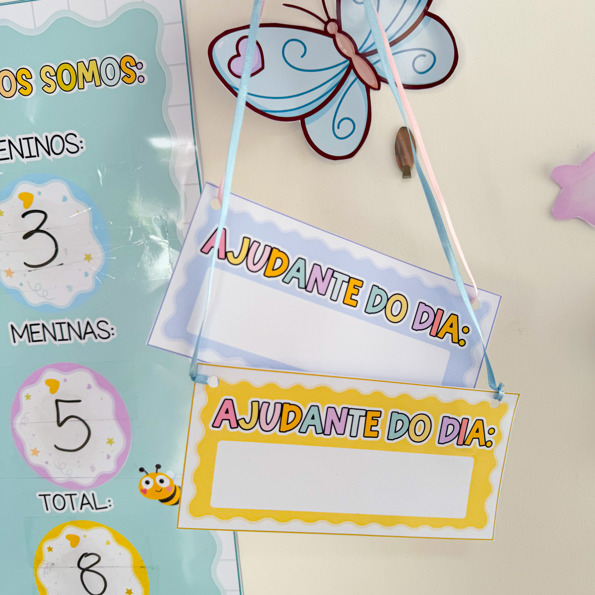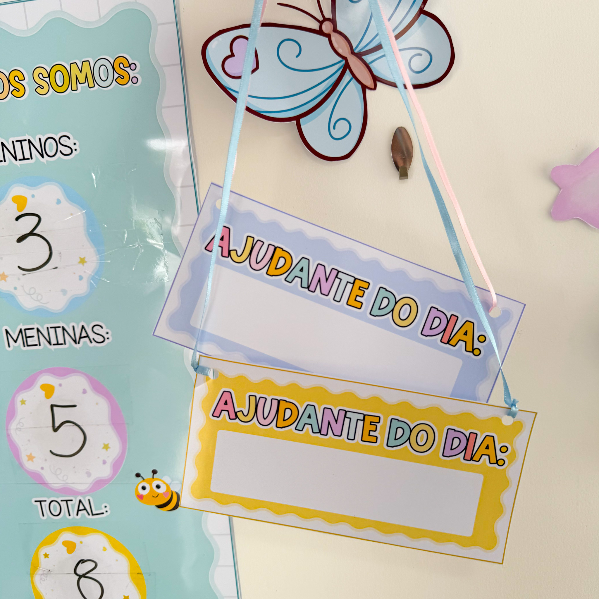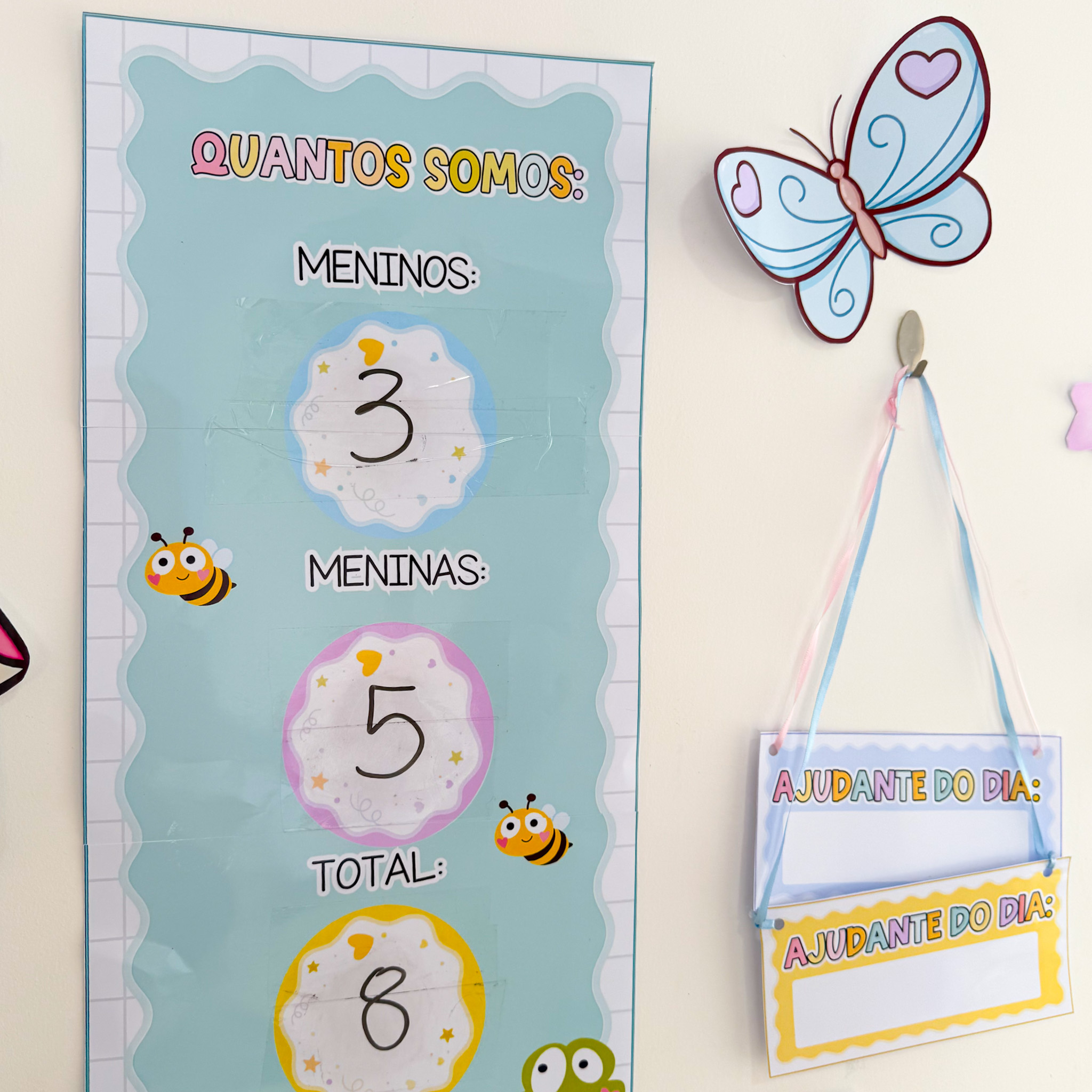 Material pedagógico composto por Quantos Somos e Ajudante do Dia, desenvolvido para apoiar a rotina escolar e incentivar a participação dos alunos no dia a dia da sala de aula.