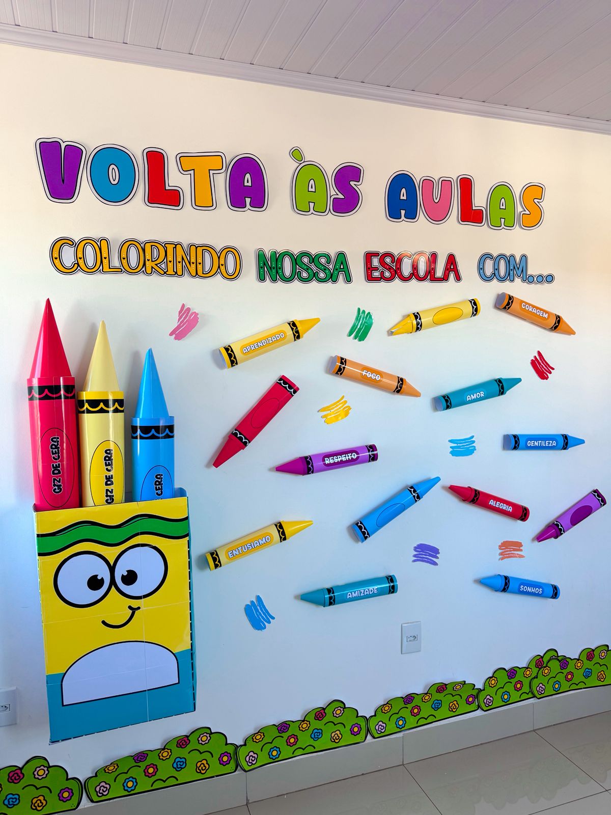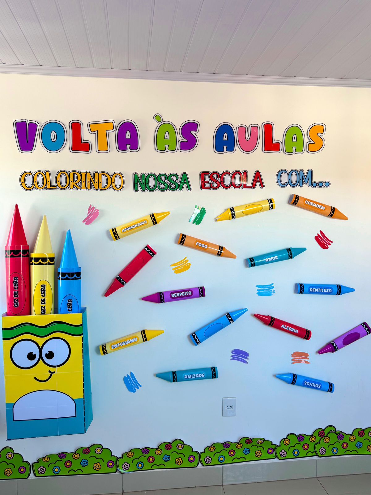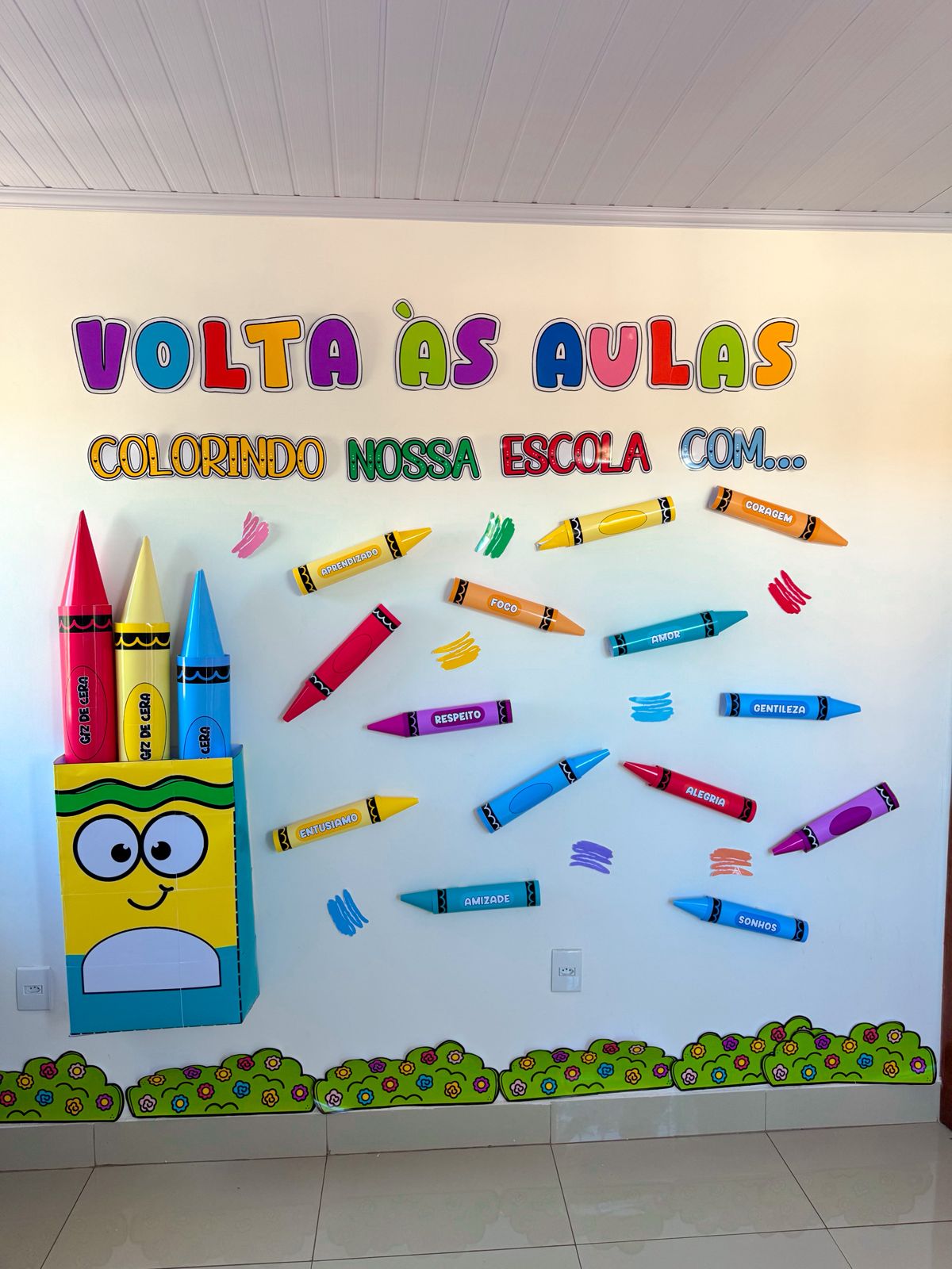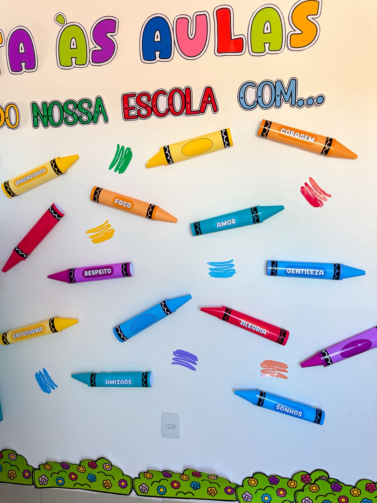 Este painel traz uma proposta divertida e afetiva, com gizes de cera coloridos contendo palavras inspiradoras como respeito, empatia, amor, amizade, entusiasmo e foco — tudo para promover um ambiente positivo desde o primeiro dia de aula.